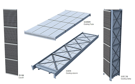 在一個夾角為 50°左右的三角形鋼構架的兩邊固定兩個冷卻柱,第三邊為空氣通道。在最低環境溫度低于 0 ℃時空氣通道上設置百葉窗,用來調節冷卻性能,避免冬季冷卻水溫過低凍壞散熱器。三角形組件是安裝基本單元,因其為三角形,所以稱作冷卻三角,冷卻三角還含有三角形蓋板、底板等部件。