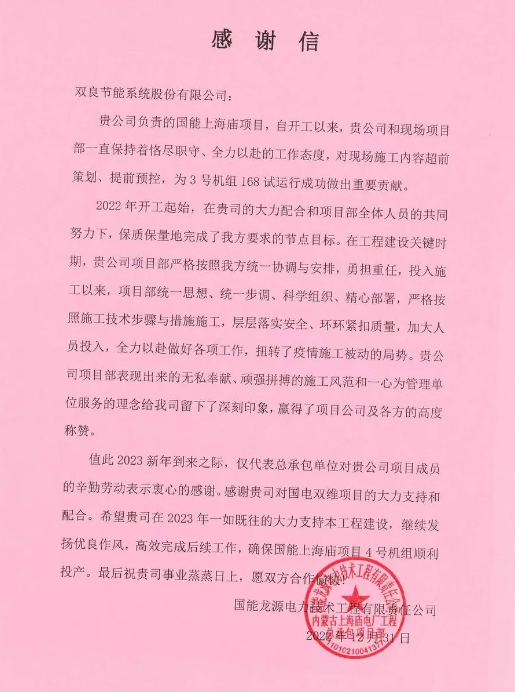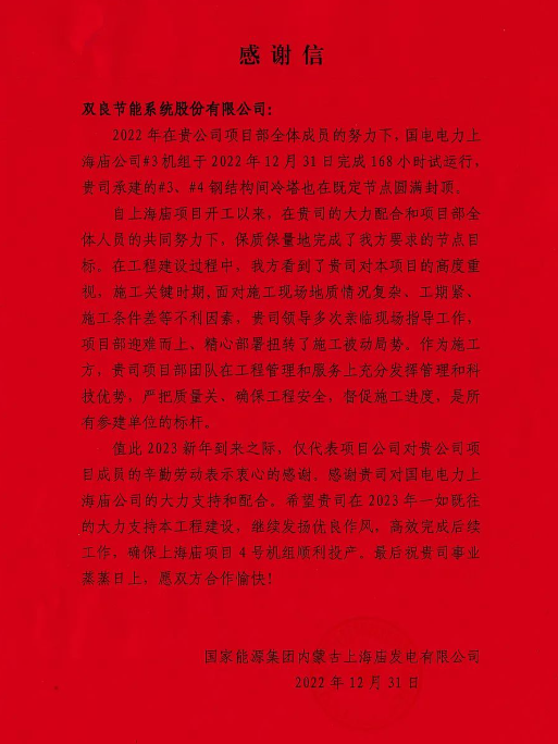 2022年是雙良在上海廟項目上取得豐碩果實的一年。項目部從2月份就進駐現(xiàn)場,期間奮力克服疫情、風(fēng)季施工等諸多不利因素,積極協(xié)調(diào)鋼塔主材和間冷系統(tǒng)設(shè)備的及時到貨,高效推進項目建設(shè),力保國能上海廟項目3號、4號鋼塔在既定節(jié)點內(nèi)圓滿封頂;系統(tǒng)設(shè)備調(diào)試保持推進,3號空冷系統(tǒng)投運前,項目部積極參與業(yè)主、總包及調(diào)試單位組織的專項檢查,對投運前空冷的完善性、合規(guī)性、完整性進行詳細檢查,提出了許多中肯建議,保證了3號機組投運前空冷具備使用條件,為3號機組168試運行成功貢獻了重要力量,項目部的優(yōu)良服務(wù)贏得了建設(shè)單位、總包單位和監(jiān)理單位領(lǐng)導(dǎo)的一致認可。